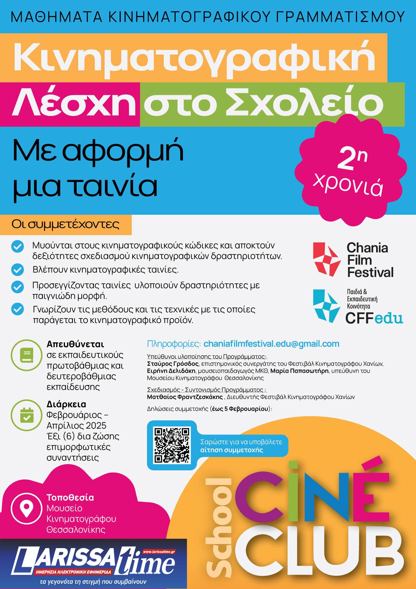 Το Μουσείο Κινηματογράφου του Φεστιβάλ Θεσσαλονίκης και το Φεστιβάλ Κινηματογράφου Χανίων μετά την ιδιαίτερα επιτυχημένη υλοποίηση του προγράμματος το 2024- και στο πλαίσιο των κοινών δράσεων των δύο φεστιβάλ- προχωρούν στην υλοποίηση του εκπαιδευτικού προγράμματος για 2η χρονιά και προσκαλούν για συμμετοχή.