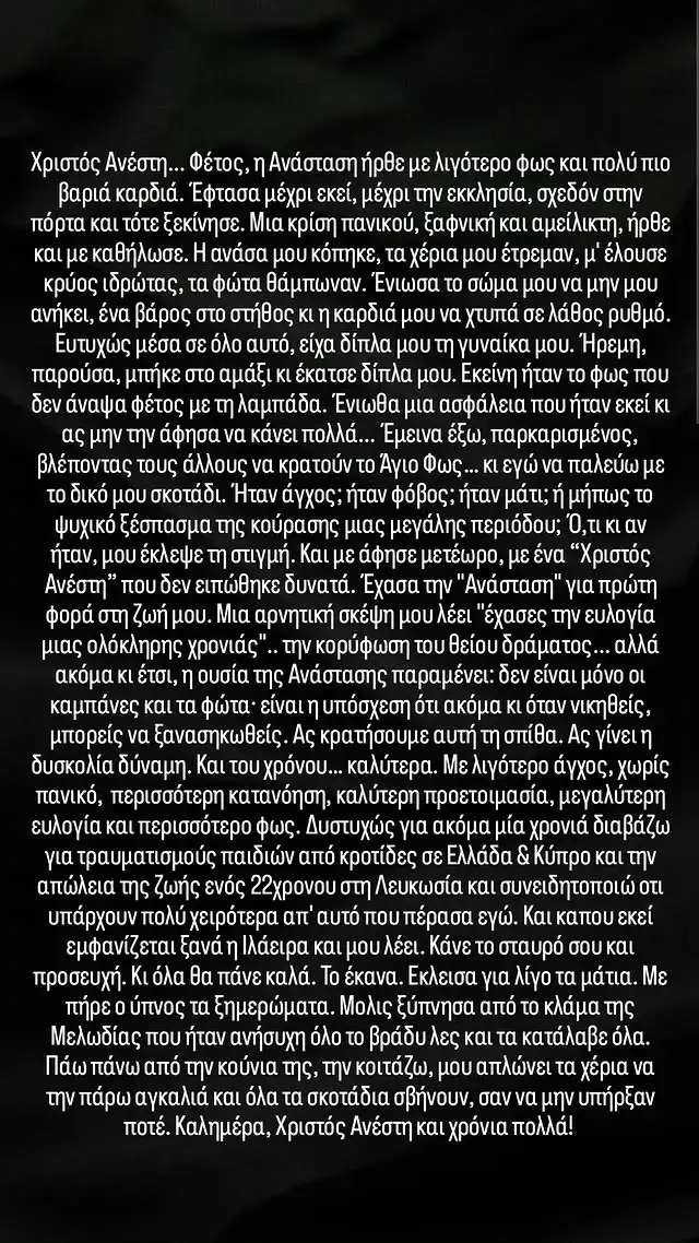 Ο γνωστός μουσικός, εξήγησε στο μακροσκελές του story ότι τον έπιασε κρίση πανικού λίγο πριν μπει στην εκκλησία και έτσι για πρώτη φορά όπως έγραψε έχασε την Ανάσταση.