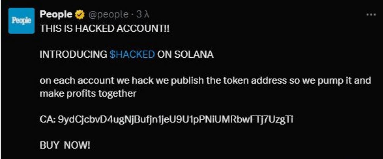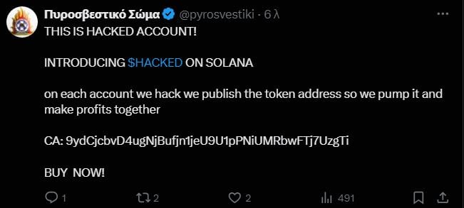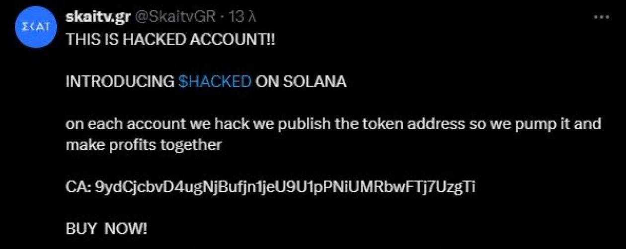 «Αυτός ο λογαριασμός έχει χακαριστεί. Σε καθένα από αυτούς δημοσιεύουμε μία διεύθυνση για να βγάλουμε κέρδος μαζί», γράφει το μήνυμα, ενώ προωθείται το κρυπτονόμισμα Solana.