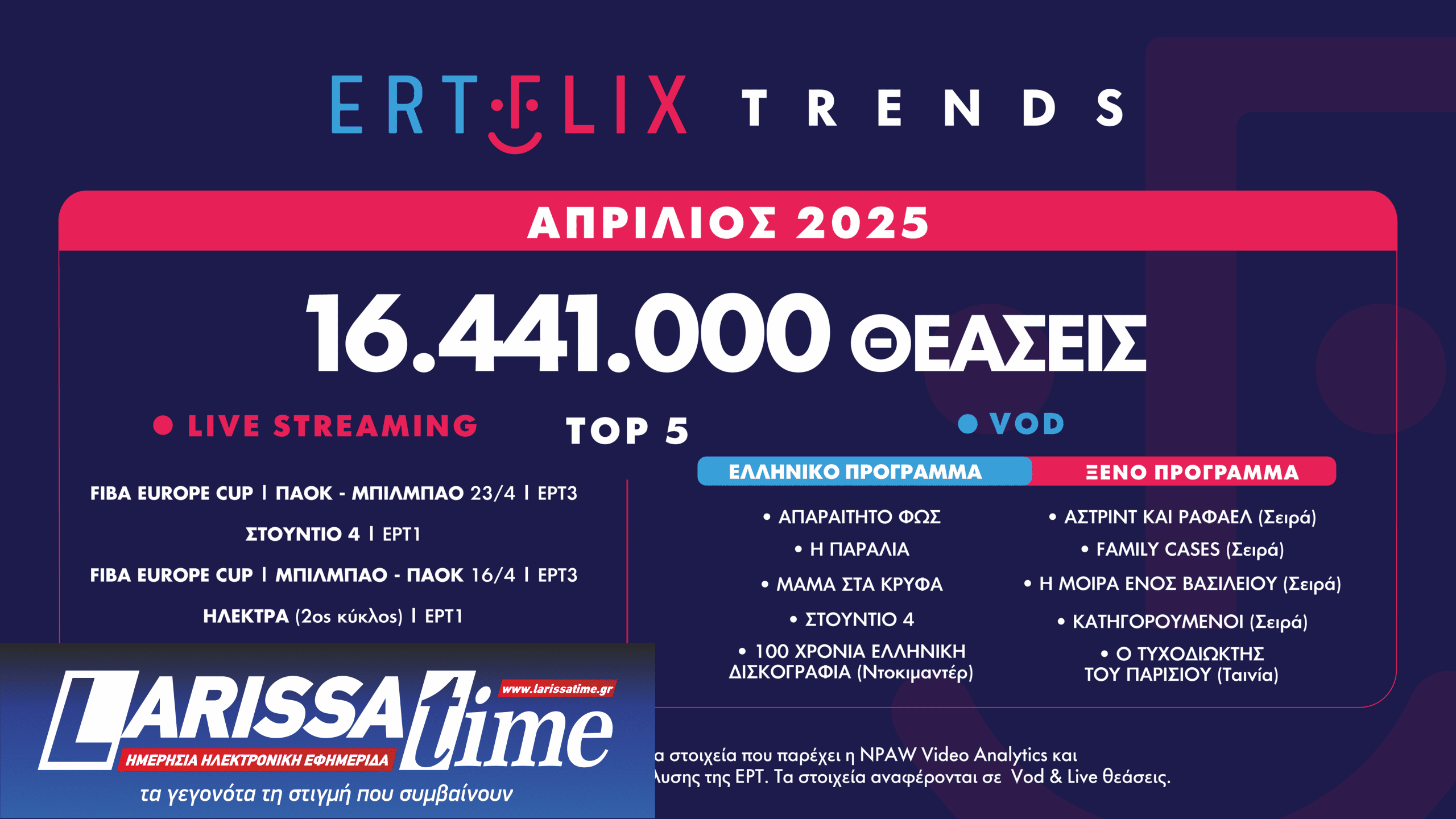 Έτσι ο περασμένος μήνας σύμφωνα με τα στοιχεία της NPAW Video Analytics, που επεξεργάζεται το τμήμα Έρευνας και Ανάλυσης της ΕΡΤ, έκλεισε με 16.441.000 θεάσεις, ενώ η μέση ημερήσια θέαση άγγιξε τις 548.000.