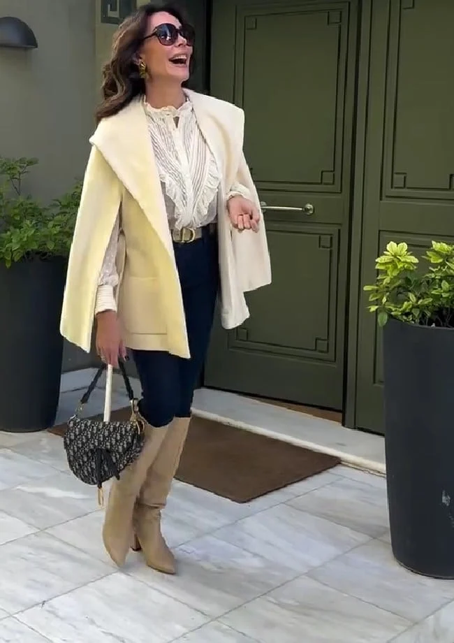 Μέσα από την κάπα της φόρεσε ένα πουκάμισο με βολάν σε ρομαντικό στιλ. Ολοκλήρωσε το look της με stretch jeans, που ανέδειξαν τα λεπτά πόδια της και ένα ζευγάρι ψηλές μπεζ μπότες μέχρι το γόνατο.
