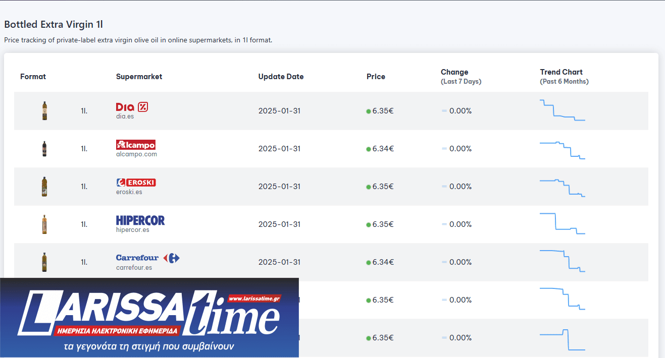 Συνοπτικά η τιμολογιακή κατάσταση της λιανικής για το έξτρα παρθένο ελαιόλαδο σήμερα (31 Ιανουαρίου 2025) στην Ισπανία: