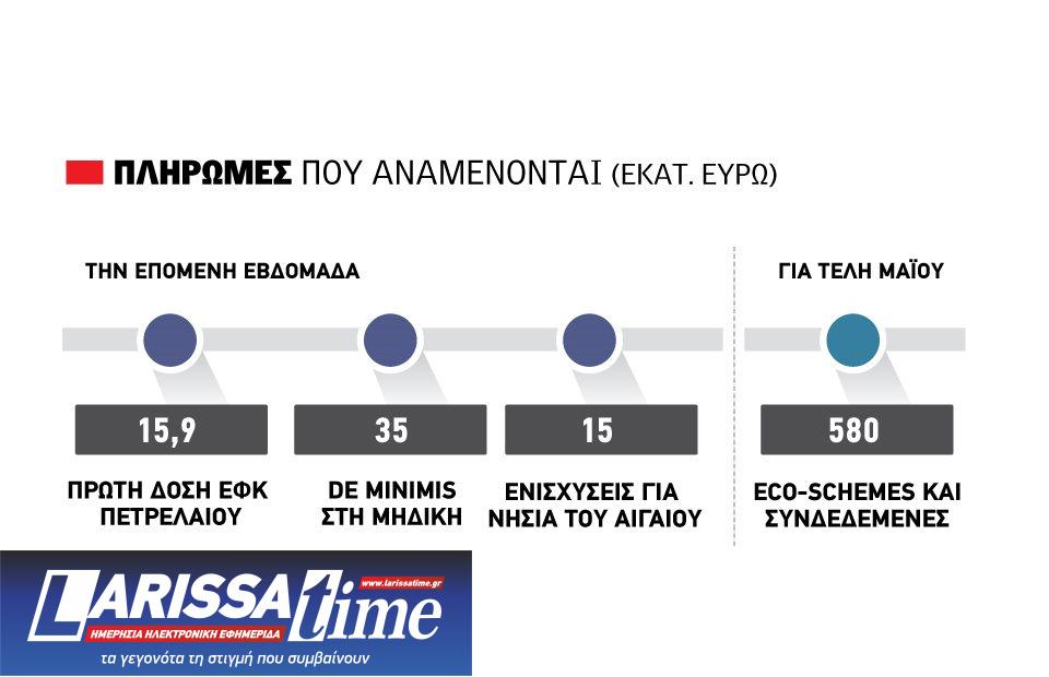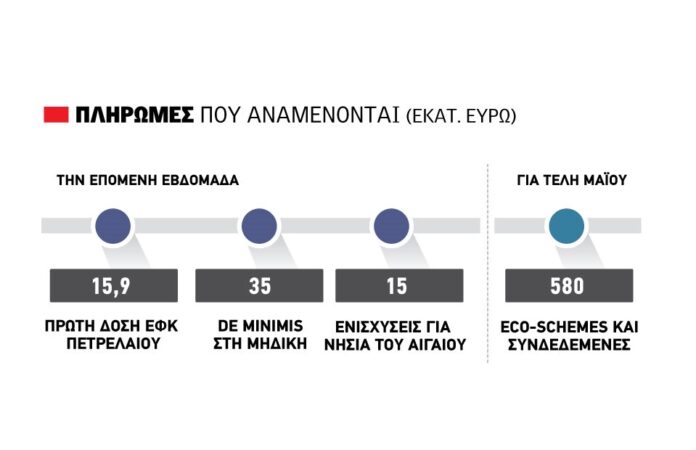 Πριν την Πρωτοµαγιά έχει ανακοινωθεί ότι θα πιστωθούν: α) η πρώτη δόση της επιστροφής του ΕΦΚ πετρελαίου, µε τον συντελεστή της επιστροφής του ΕΦΚ ως γνωστόν να ανέρχεται στο ποσό των 0,41 ευρώ το λίτρο. Στην αντίστοιχη περσινή πίστωση για την πρώτη δόση καταβλήθηκε σε 76.128 επαγγελµατίες αγρότες το ποσό των 15.921.068,34 ευρώ. β) τα de minimis ύψους 35 εκατ. σε παραγωγούς µηδικής, µε τη σχετική απόφαση να έχει ήδη υπογραφεί από το ΥπΑΑΤ και να περιµένει µόνο το πράσινο φως από το υπουργείο Οικονοµικών και γ) οι ενισχύσεις για τα Μικρά Νησιά του Αιγαίου, οι οποίες πέρυσι ανήλθαν στο ποσό των 15 εκατ. ευρώ.