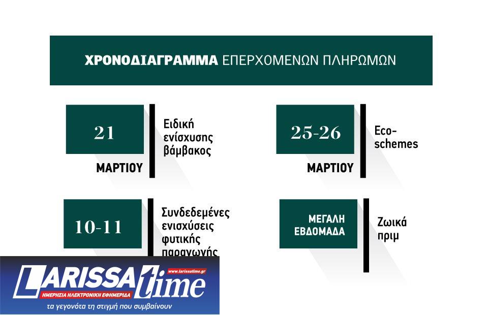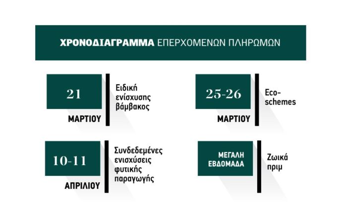 Αναφορικά τώρα µε τις συνδεδεµένες ενισχύσεις, οι πληρωµές αναµένεται να ξεκινήσουν πριν το Σάββατο του Λαζάρου, δηλαδή 10-11 Απριλίου και όσες δεν προλάβουν θα µπουν στους λογαριασµούς µέσα στη Μεγάλη Εβδοµάδα.