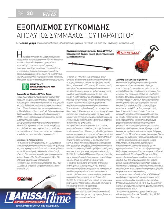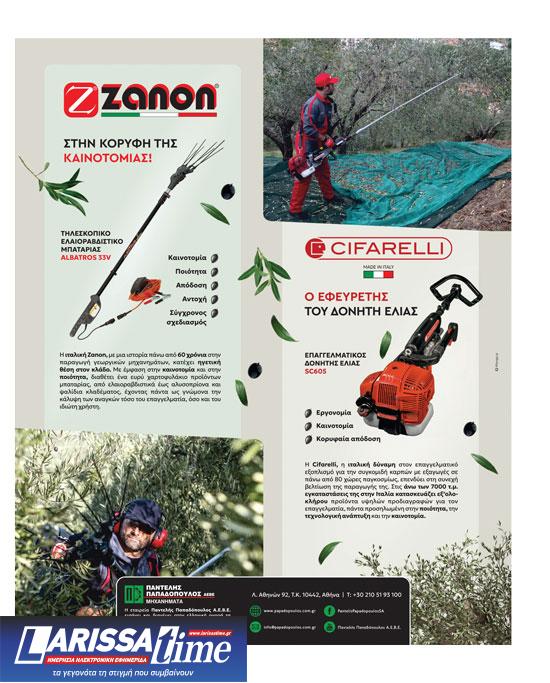 Η ιταλική ZANON, µε εµπειρία άνω των 60 ετών στην παραγωγή γεωργικών µηχανηµάτων, προσφέρει µια ολοκληρωµένη λύση για την περιποίηση και τη συγκοµιδή της ελιάς, διαθέτοντας πλούσια γκάµα προϊόντων όπως: ελαιοραβδιστικά, αλυσοπρίονα και κονταροαλυσοπρίονα, ψαλίδια κλαδέµατος, θρυµµατιστές κλαδιών και αξεσουάρ.