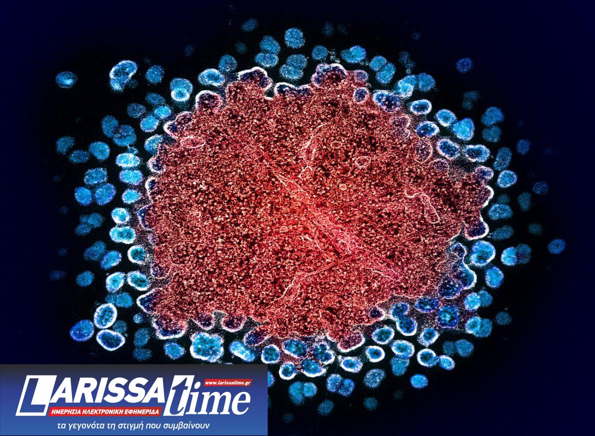 Ο ιός HIV (μπλε) αναπαράγεται σε προσβεβλημένα Τ κύτταρα (κόκκινα). Φωτό από το ερευνητικό εργαστήριο του NIAID στο Maryland των ΗΠΑ