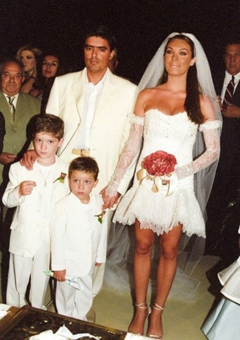 Το νυφικό της Τατιάνας Στεφανίδου είχε την υπογραφή του Μάκη Τσέλιου, ενώ έκανε εντύπωση το mini μήκος του, το οποίο αναδείκνυε τα υπέροχα πόδια της. Η Τατιάνα Στεφανίδου μάλιστα έκανε αυτή την τολμηρή επιλογή του κοντού νυφικού, ενώ ήταν έγκυος στην κόρη της Λυδία. Στα μαλλιά της φορούσε ένα μακρύ πέπλο και δαντελωτά γάντια μέχρι τον αγκώνα, που έκαναν ακόμη πιο εντυπωσιακή την εμφάνισή της.