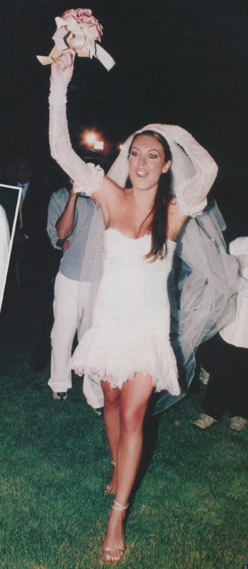 Το νυφικό της Τατιάνας Στεφανίδου είχε την υπογραφή του Μάκη Τσέλιου, ενώ έκανε εντύπωση το mini μήκος του, το οποίο αναδείκνυε τα υπέροχα πόδια της. Η Τατιάνα Στεφανίδου μάλιστα έκανε αυτή την τολμηρή επιλογή του κοντού νυφικού, ενώ ήταν έγκυος στην κόρη της Λυδία. Στα μαλλιά της φορούσε ένα μακρύ πέπλο και δαντελωτά γάντια μέχρι τον αγκώνα, που έκαναν ακόμη πιο εντυπωσιακή την εμφάνισή της.