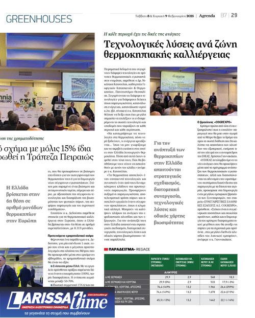 Η επιδότηση 50-70% που θα είναι διαθέσιµη για αιτήσεις εντός ολίγων εβδοµάδων, έχει ως στόχο να αυξήσει τα στρέµµατα υπό κάλυψη στην Ελλάδα κατά 10-15% µε επενδύσεις 600 εκατ. ευρώ, σύµφωνα µε τα όσα ειπώθηκαν στην εσπερίδα «Θερµοκήπια Smart Greenhouses: Το Μέλλον της Ελληνικής Γεωργίας», που διοργάνωσε στις 31 Ιανουαρίου 2025, στο πλαίσιο της Zootechnia, η ΕΚΑΓΕΜ, µε την ευγενική χορηγία της Πειραιώς και της εταιρείας «Πλαστικά Κρήτης ΑΕ». Το ζήτηµα πλέον είναι να αξιοποιηθούν σωστά αυτά τα χρήµατα και ως εκ τούτου κρίσιµο είναι να υπάρξει η σωστή κατεύθυνση και να επιλεχθεί η τεχνολογία που ταιριάζει σε κάθε περιοχή, µε τον ∆ρ. Νικόλαο Κατσούλα, καθηγητή Γεωργικών Κατασκευών & Θερµοκηπίων, στο Πανεπιστήµιο Θεσσαλίας να φέρνει στο «φως» συγκριτικούς πίνακες µε τις αποδόσεις διαφορετικά εξοπλισµένων θερµοκηπίων.