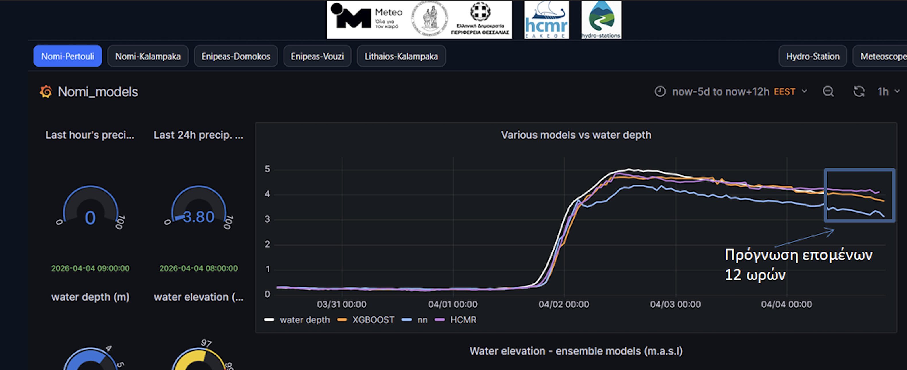 - ενώ παράλληλα ενσωματώνει δυναμικά τις πραγματικές μετρήσεις στάθμης από τους υδρολογικούς σταθμούς, βελτιώνοντας συνεχώς την ακρίβεια της πρόγνωσης.