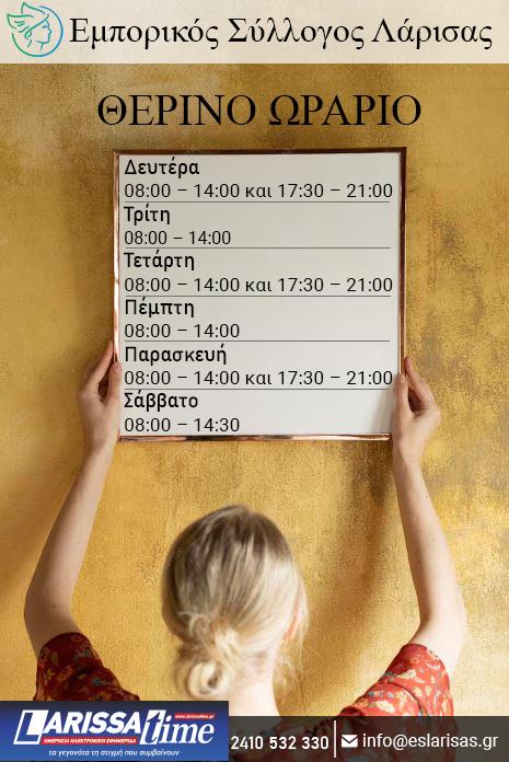 Από τον Εμπορικό Σύλλογο Λάρισας ανακοινώνεται, ότι το προτεινόμενο θερινό ωράριο λειτουργίας των καταστημάτων – μελών του Εμπορικού Συλλόγου Λάρισας για το 2024 μετά την αλλαγή της ώρας, θα ξεκινήσει από την Δευτέρα 1η Απριλίου και διαμορφώνεται ως εξής: