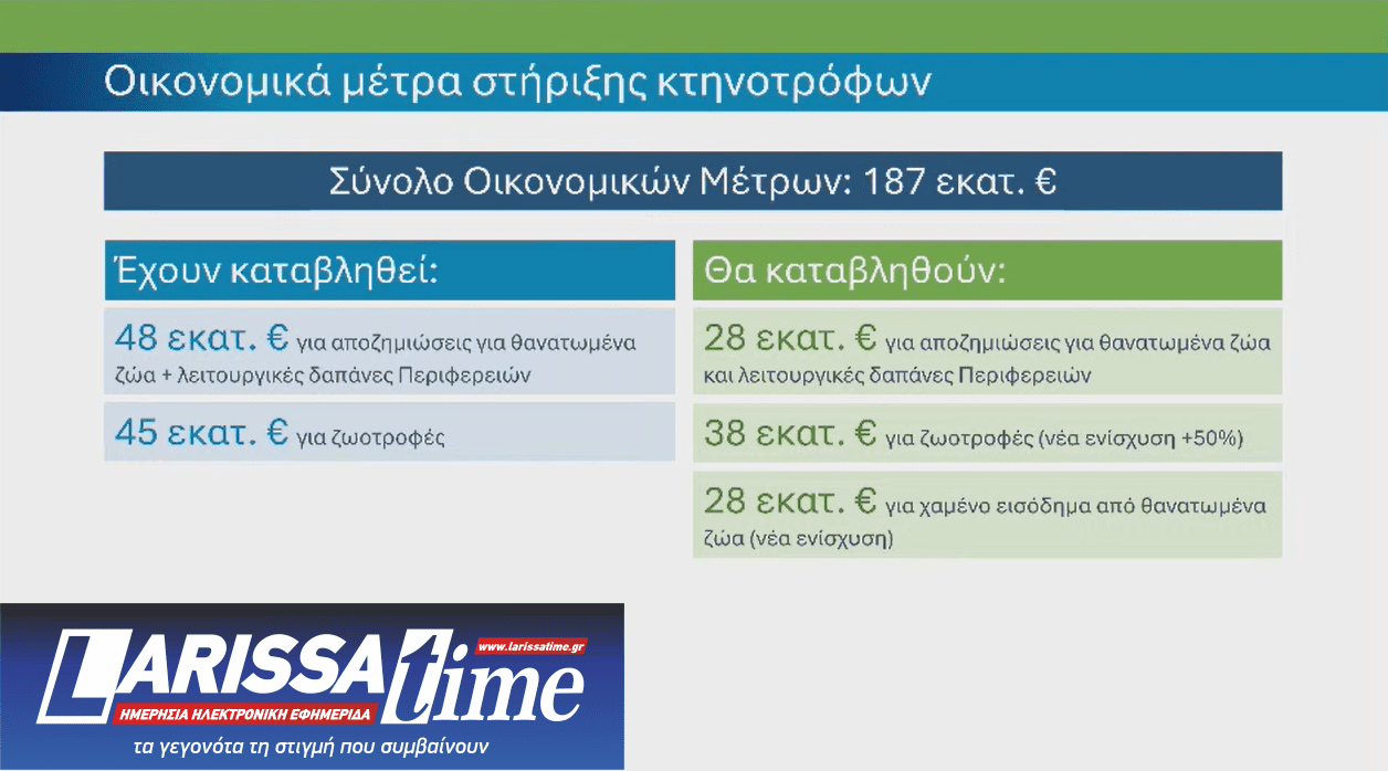 - Τα επιπλέον 28 εκατ. ευρώ ως συμπληρωματική ενίσχυση ζωοτροφών θα καταβληθούν μέχρι τέλος του έτους