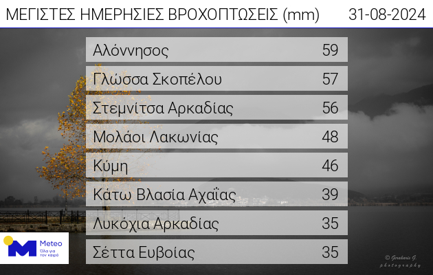 Σύμφωνα με τις καταγραφές του δικτύου αυτόματων μετεωρολογικών σταθμών του meteo.gr / Εθνικού Αστεροσκοπείου Αθηνών το μεγαλύτερο αθροιστικό ύψος υετού, έως τις 18:00 περίπου, καταγράφηκε στην Αλόννησο και ήταν ίσο με 59 χιλιοστά. Στον σχετικό πίνακα παρουσιάζονται οι 8 σταθμοί του δικτύου που κατέγραψαν τα μεγαλύτερα ύψη βροχής έως τις 18:00 περίπου του Σαββάτου 31/08.
