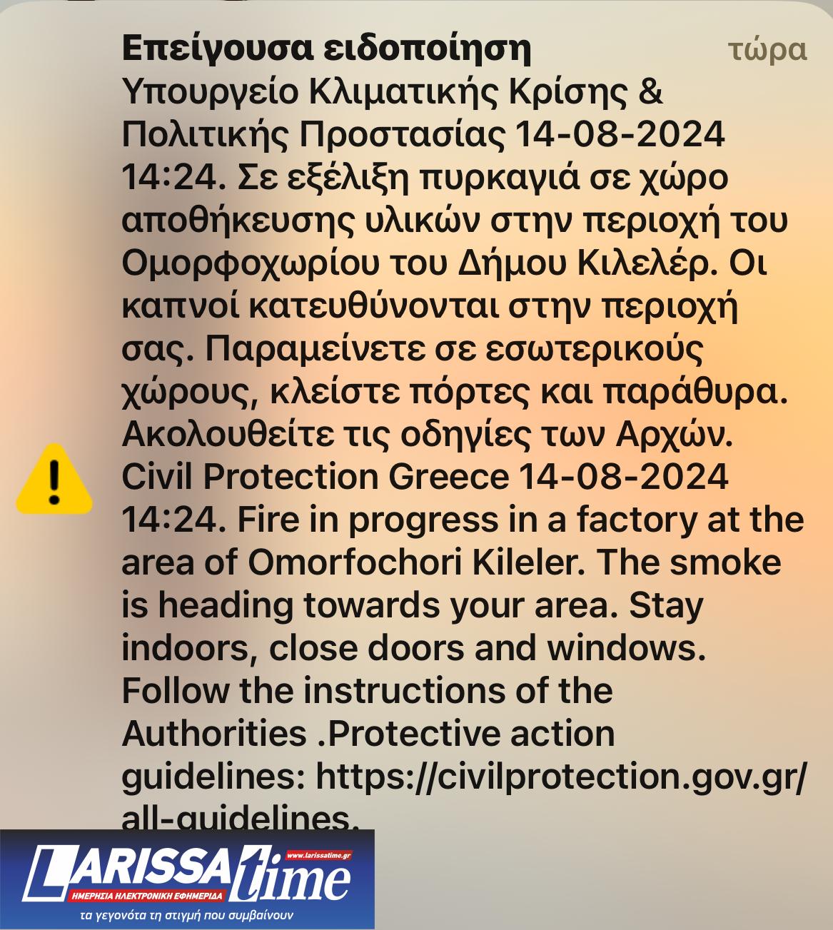 Μήνυμα του 112 ήχησε στα κινητά τηλέφωνα των κατοίκων της Λάρισας στις 2:24 το μεσημέρι της Τετάρτης, σχετικά με την μεγάλη φωτιά στο Ομορφοχώρι της Λάρισας.