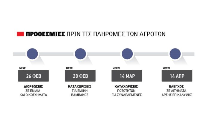 Μετά το πέρας της προθεσµίας, βέβαια, θα χρειαστεί κάποιο χρονικό διάστηµα προκειµένου να γίνουν διορθώσεις, προσθήκες, τροποποιήσεις, διασταυρώσεις και έλεγχοι, ούτως ώστε µέχρι το τελευταίο δεκαήµερο του Μαρτίου, να µπορέσουν να πληρωθούν -χωρίς λάθη και αστοχίες- τα οικολογικά σχήµατα (eco-schemes) ύψους 400 εκατ. ευρώ και κάποια από τα υπόλοιπα ενιαίας ενίσχυσης της περσινής χρονιάς συνολικού ποσού περί τα 100 εκατ. ευρώ. Πέρυσι, υπενθυµίζεται ότι το σύστηµα έκλεισε στις 12 Μαρτίου και τελικά τα οικοσχήµατα πληρώθηκαν Μεγάλη Τρίτη 30 Απριλίου, µε ποσό 398.483.010,89 ευρώ σε 551.717 δικαιούχους.