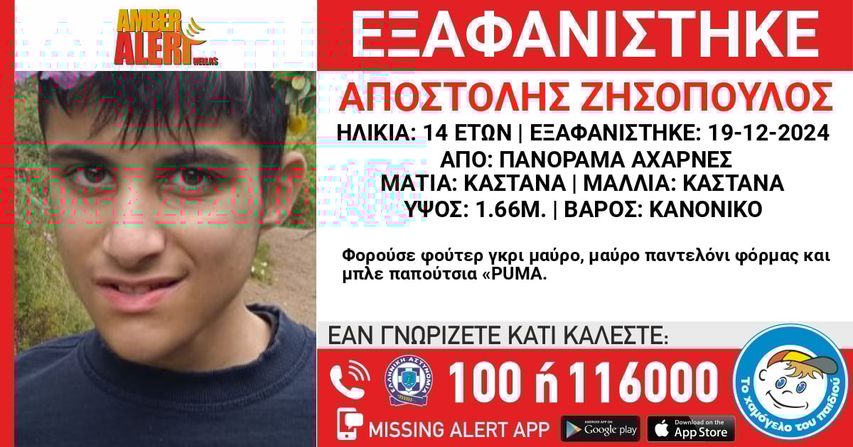 Στις 19 Δεκεμβρίου 2024, και ώρα 16:15, ο 14χρονος Αποστόλης Ζησόπουλος εξαφανίστηκε από την περιοχή του Μενιδίου. Το «Χαμόγελο του Παιδιού» κινητοποιήθηκε άμεσα, ενεργοποιώντας τον μηχανισμό AMBER ALERT HELLAS, κατόπιν εισαγγελικής εντολής, καθώς η ζωή του ανηλίκου θεωρείται ότι βρίσκεται σε κίνδυνο.