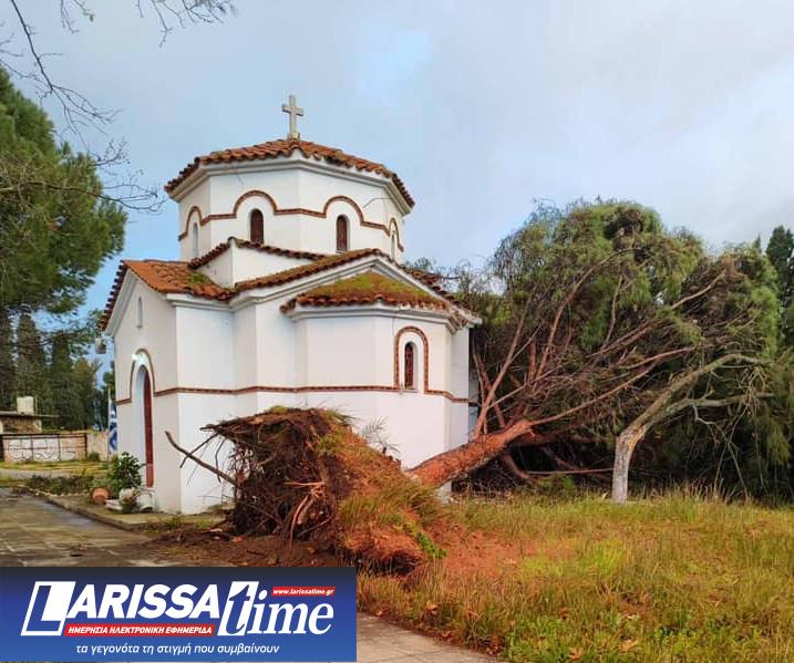 Ξεριζωμένο δέντρο δίπλα στην εκκλησία μετά το πέρασμα του ανεμοστρόβιλου (Πηγή: agrinionews.gr)