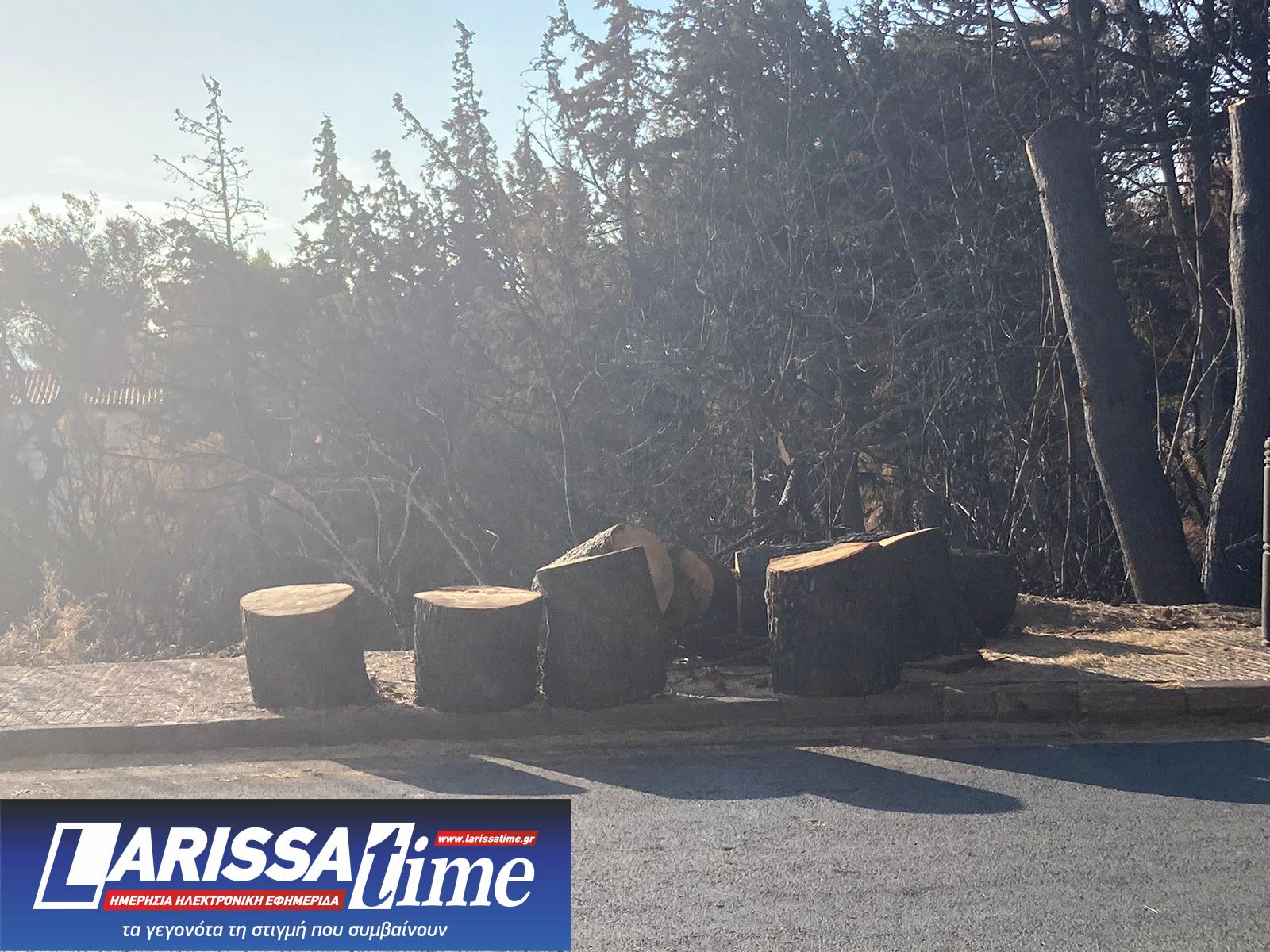 Στη λεωφόρο Πεντέλης τα καμένα έχουν κοπεί και περιμένουν κάποιον να τα μαζέψει…