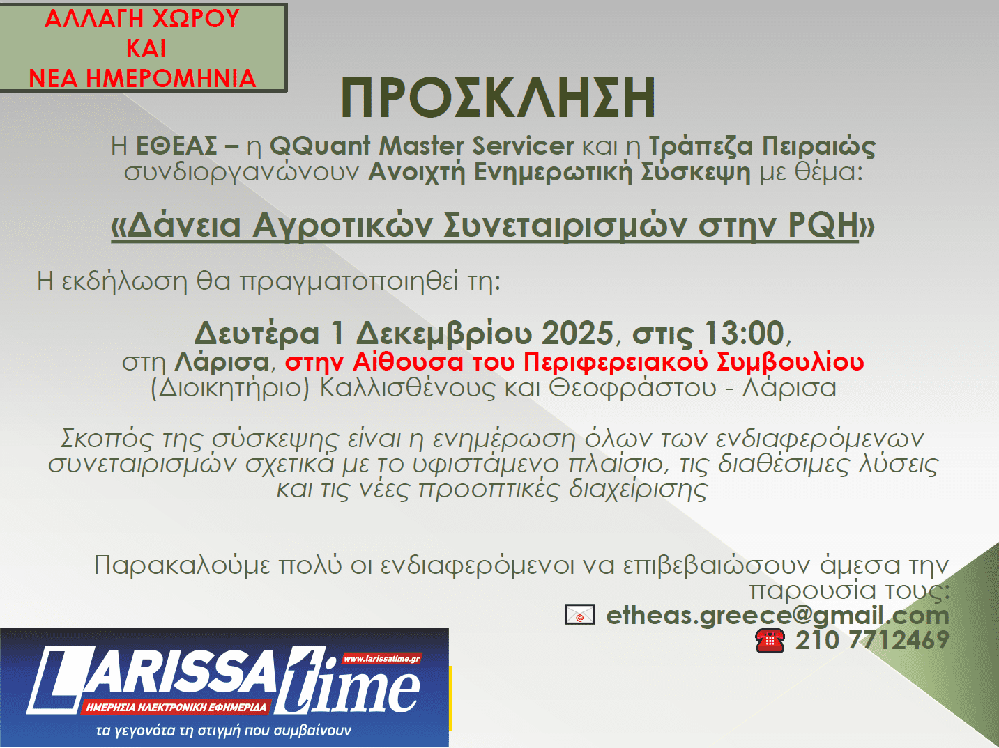 Μετατίθεται για 1/12 η ενημερωτική σύσκεψη για δάνεια Αγροτικών Συνεταιρισμών στην PQH