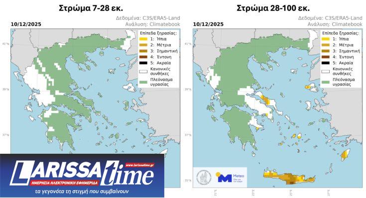 Αναλυτικά, το παρόν δελτίο παρουσιάζει την ανάλυση της ομάδας ΜΕΤΕΟ του ΕΑΑ για τις συνθήκες ξηρασίας στην Ελλάδα κατά την 10η Δεκεμβρίου 2025. Η ανάλυση βασίζεται στην απόκλιση της υγρασίας των στρωμάτων υπεδάφους από τα κανονικά για την εποχή επίπεδα σε δύο στρώματα: