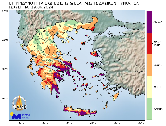 - Πολύ υψηλό δυναμικό ώστε τυχόν δασικές πυρκαγιές που εκδηλωθούν να είναι καθοδηγούμενες από τον άνεμο με δυνητικά μεγάλα θερμικά φορτία αναμένεται σε Αττική, Βοιωτία (τοπικά), Κ. και Ν. Εύβοια, Λακωνία, Χίο, Σάμο και Ν. Κρήτη.