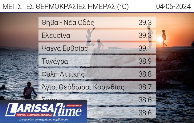 Η τιμή αυτή ξεπεράστηκε στην Ελευσίνα και στη Θήβα (Νέα Οδός) όπου η μέγιστη θερμοκρασία την Τρίτη 04/06/2024 έφτασε τους 39.3 °C.