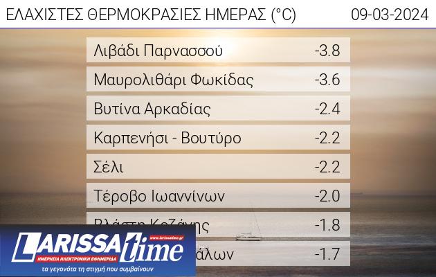 Στο Μαυρολιθάρι Φωκίδας το θερμόμετρο έδειξε -3.6°C, στη Βυτίνα Αρκαδίας -2.4°C, στο Καρπενήσι και το Σέλι -2.2°C και στο Τέροβο Ιωαννίνων -2.0°C