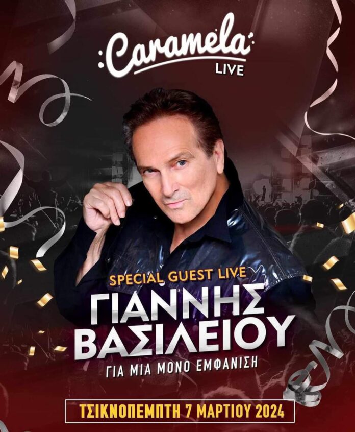 Μία μοναδική βραδιά διασκέδασης αναμένεται στο Caramela Live την Τσικνοπέμπτη 7 Μαρτίου, αφού θα βρίσκεται μαζί με το ήδη επιτυχημένο σχήμα που μας διασκεδάζει κάθε Παρασκευή και Σάββατο, για μία μοναδική εμφάνιση, ο αγαπημένος τραγουδιστής των επιτυχιών Γιάννης Βασιλείου.