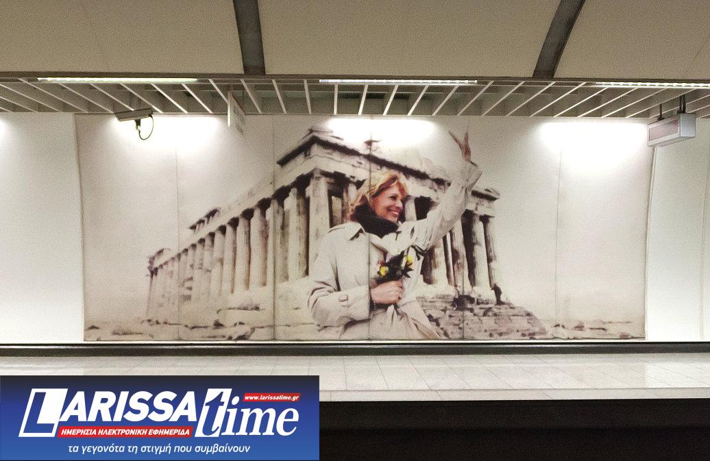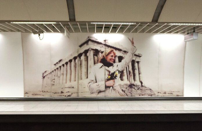 Πρόκειται για την περίφημη φωτογραφία που απεικονίζει υπουργό Πολιτισμού επί κυβερνήσεων Ανδρέα Παπανδρέου να χαιρετά χαμογελαστή πάνω στον Ιερό Βράχο της Ακρόπολης, κρατώντας ένα μπουκέτο λουλούδια. Η τεράστια αφίσα κοσμεί τον σταθμό του Μετρό, «Ακρόπολη», από την αρχή της δημιουργίας του.