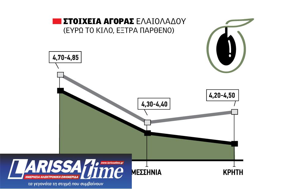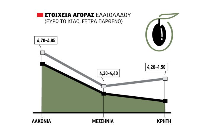 Η Κρήτη µάλλον διατηρεί την µάλλον πιο σκληρή και αµυντική στάση. Αν και επίσηµα νούµερα δεν υπάρχουν -δοµικό πρόβληµα- οι περισσότεροι συνοµιλητές της Agrenda εκτιµούν ότι το 65-70% της σοδειάς βρίσκεται στις δεξαµενές, ενώ εσχάτως συνεταιρισµοί πήραν το ρίσκο και απέρριψαν προσφορές από 4,70 έως 5,20 ευρώ το κιλό. Στην υπόλοιπη Ελλάδα επικρατεί µια ανοµοιογένεια. Οι τιµές παίζουν από 4,20 έως 4,80 ευρώ το κιλό, πάντα για τις 3 γραµµές, ενώ το ενδιαφέρον των παραγωγών για πράξεις είναι περιορισµένο και εκδηλώνεται κυρίως µόνο όταν το επιβάλλουν οι όροι διαβίωσης του καθενός.