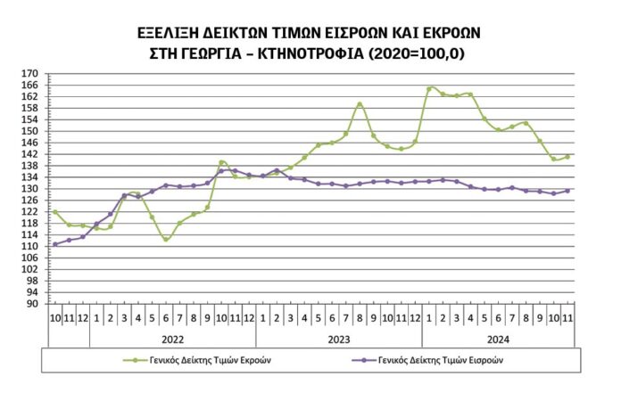 Η μείωση του Γενικού Δείκτη Τιμών Εκροών κατά 1,9%, τον μήνα Νοέμβριο 2024, σε σύγκριση με τον αντίστοιχο δείκτη του Νοεμβρίου 2023 (Πίνακας 1), οφείλεται: α) στη μείωση κατά 2,2% του δείκτη τιμών της φυτικής παραγωγής και κυρίως στη μεταβολή της ομάδας ελαιόλαδο, και β) στην αύξηση κατά 0,8% του δείκτη τιμών της ζωικής παραγωγής.