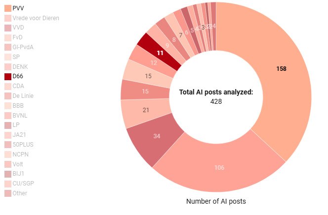 Το Κόμμα για την Ελευθερία (PVV) του Γκερτ Βίλντερς s, γνωστό για τη σκληρή στάση του απέναντι στη μετανάστευση και τον ισλαμισμό, δημιούργησε τον μεγαλύτερο όγκο υλικού που δημιουργήθηκε με τεχνητή νοημοσύνη.
