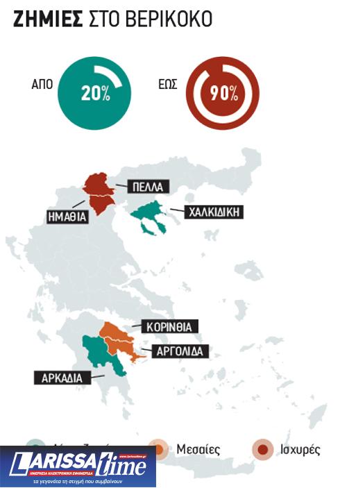 Η «ακτινογραφία» της καλλιέργειας στην Ελλάδα σήµερα δείχνει πως στην πιο δύσκολη θέση βρίσκονται τα περιβόλια µε βερίκοκα στον κάµπο των Γιαννιτσών στην Πέλλα, ο οποίος εκτείνεται, συνολικά, σε περίπου 25.000 στρέµµατα και σε οικισµούς όπως ο Παλαιός και ο Νέος Μυλότοπος, το Αχλαδοχώρι, η Αραβησσός, η Καρυώτισσα, το Μελίσσι και οι Αµπελιές. Ο ισχυρός παγετός το τριήµερο 18-20 Μαρτίου, επέφερε σχεδόν καθολικό πλήγµα και στη συνέχεια τα αποτελείωσε η κακοκαιρία της περασµένης εβδοµάδας.