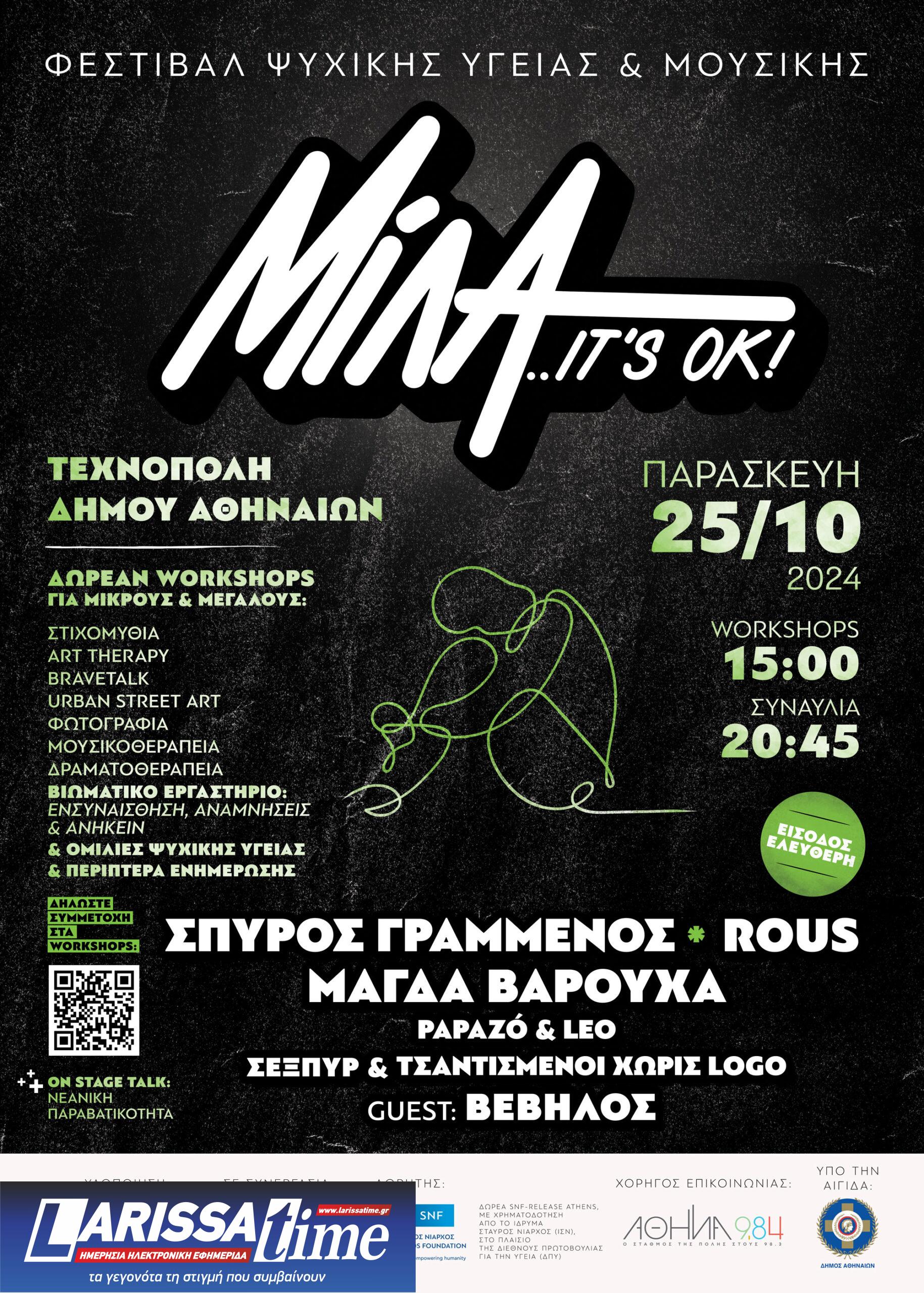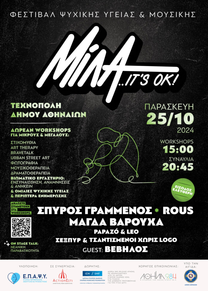 Το 4ο Φεστιβάλ Ψυχικής Υγείας & Μουσικής «ΜΙΛΑ… It’s OK!» έρχεται στην Αθήνα! Καλούμε μικρούς και μεγάλους την Παρασκευή 25 Οκτωβρίου 2024, στην Τεχνόπολη Δήμου Αθηναίων, για μια μέρα γεμάτη δράσεις που στοχεύουν στην προαγωγή της ψυχικής υγείας υπό τους ήχους της μουσικής! Ελάτε για να ενημερωθείτε, να εκφραστείτε και να συμμετάσχετε σε βιωματικές δραστηριότητες που αξιοποιούν την τέχνη και τη μουσική για να ευαισθητοποιήσουν σχετικά με θέματα ψυχικής υγείας.