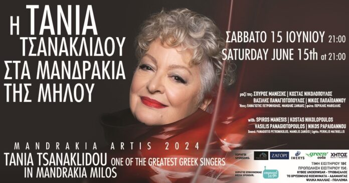 H μεγάλη ερμηνεύτρια Τάνια Τσανακλίδου γιορτάζοντας μαζί μας τα 50 χρόνια καριέρας της θα μας τιμήσει ανοίγοντας όχι μόνο το Φεστιβάλ MANDRAKIA ARTIS 2024 με μια μοναδική συναυλία στο λιμανάκι του οικισμού, αλλά και τις καλοκαιρινές της συναυλίες για το 2024, οι οποίες θα είναι λίγες και προσεκτικά επιλεγμένες. Ένα ευρύ ρεπερτόριο από μια σπουδαία καλλιτέχνιδα για πρώτη φορά στα Μανδράκια της Μήλου και μάλιστα σε έναν ιδιαίτερο χώρο που αποθεώνει τη λυρικότητα της ερμηνεύτριας.