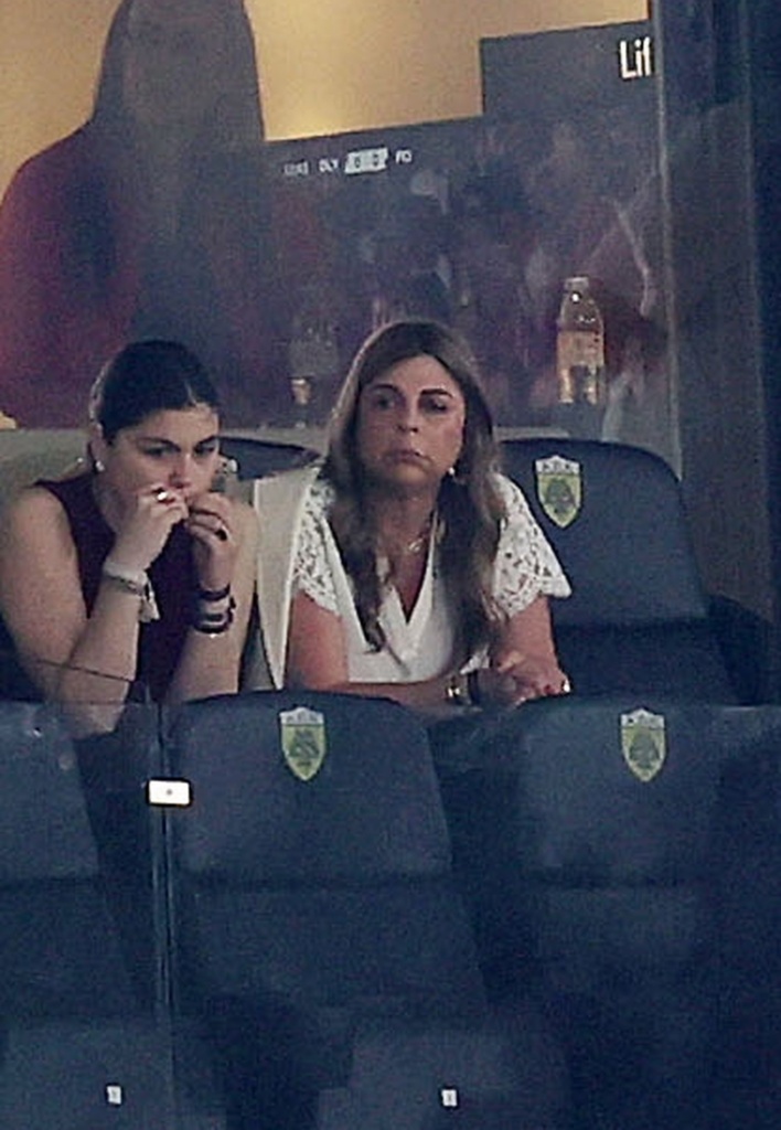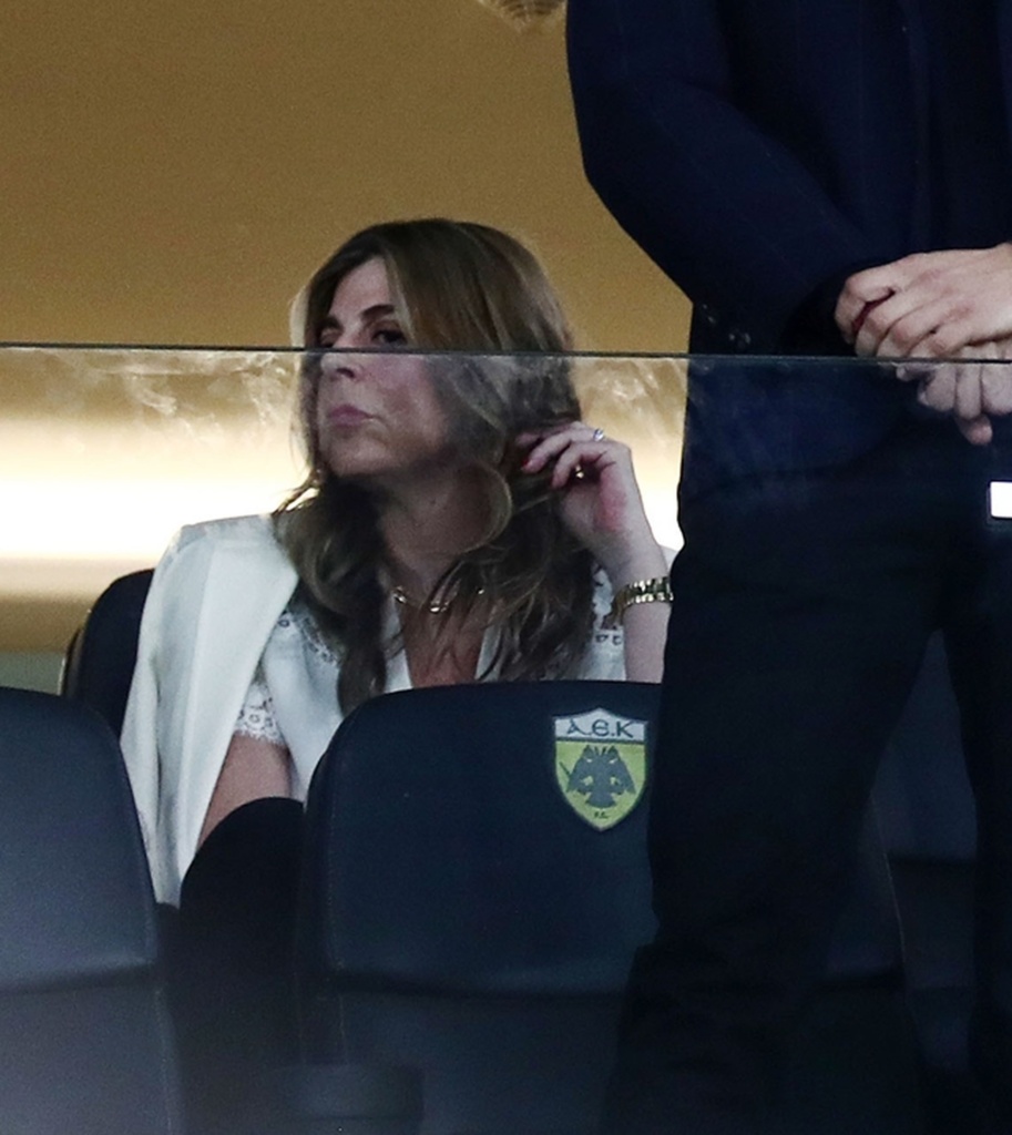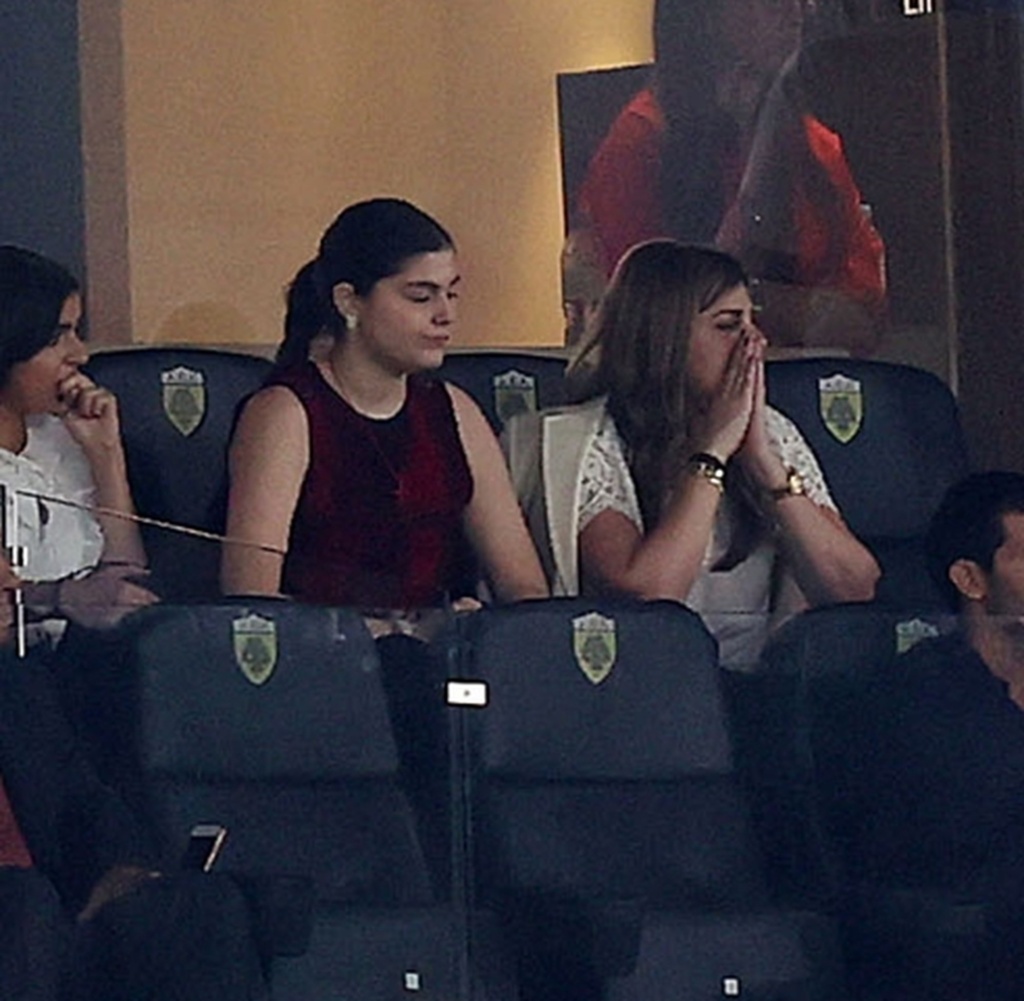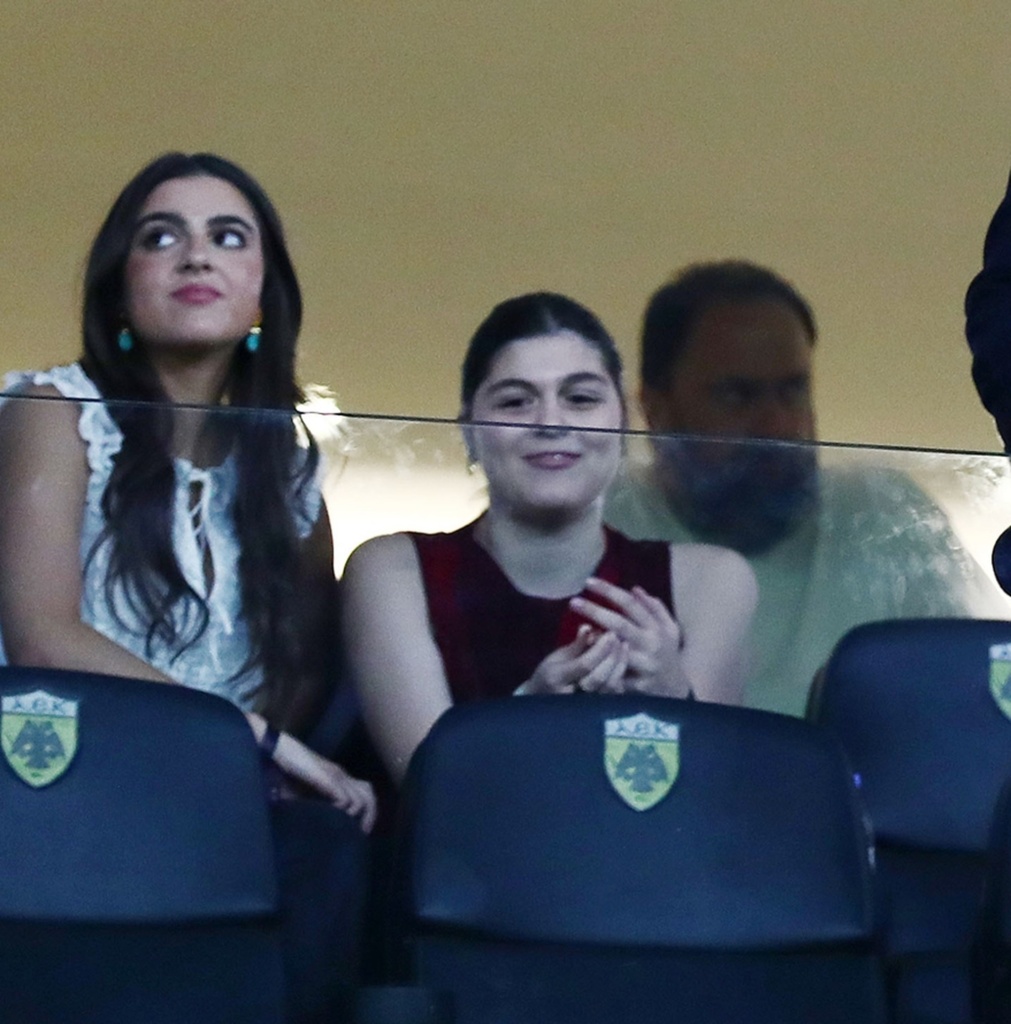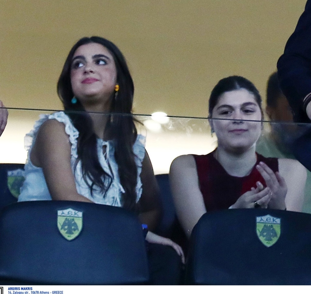 Οι κόρες του ζεύγους Ειρήνη και Ελένη Μαρινάκη παρακολούθησαν και εκείνες με αγωνία το ματς. Η μία κόρη φόρεσε λευκό τοπ με βολάν και η άλλη ένα αμάνικο τοπ σε μπορντώ απόχρωση.