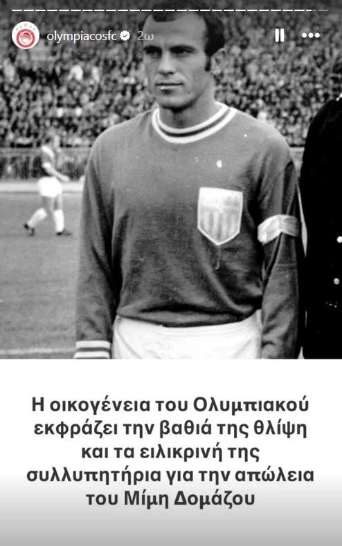 «Η οικογένεια του Ολυμπιακού εκφράζει την βαθιά της θλίψη και τα ειλικρινή της συλλυπητήρια για την απώλεια του Μίμη Δομάζου», έγραψαν οι ερυθρόλευκοι σε Story στο Instagram.
