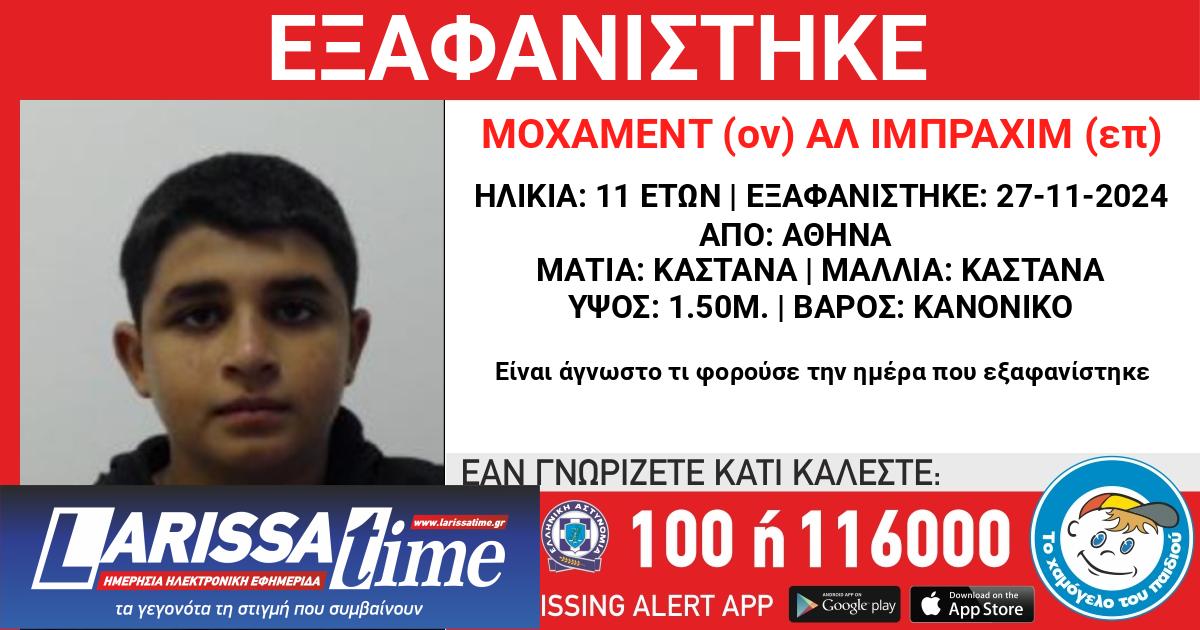Εξαφανίστηκε εδώ και περίπου έναν μήνα από από την Αθήνα, όπου είχε μεταβεί από χώρο φιλοξενίας που διέμενε ο 11χρονος Μοχάμεντ Αλ Ιμπραχίμ, συριακής καταγωγής.