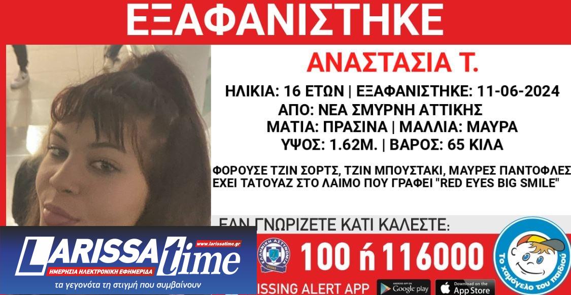 Η 16χρονη Αναστασία Τ. εξαφανίστηκε στις 11/06/2024, μεσημεριανές ώρες, από χώρο παιδικής προστασίας στην περιοχή της Νέας Σμύρνης Αττικής. «Το Χαμόγελο του Παιδιού» ενημερώθηκε σήμερα 13/6/2024 και προχώρησε στη δημοσιοποίηση των στοιχείων της ανήλικης κατόπιν εισαγγελικής εντολής, καθώς συντρέχουν λόγοι που θέτουν τη ζωή της σε κίνδυνο.
