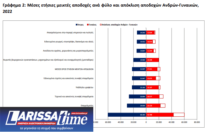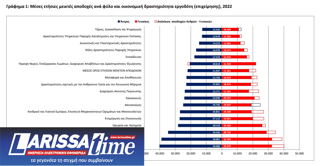 Από τα αποτελέσματα της έρευνας της ΕΛΣΤΑΤ, προκύπτει ότι για το έτος 2022, οι μεγαλύτερες μέσες ετήσιες μεικτές αποδοχές καταγράφονται στον κλάδο των Χρηματοπιστωτικών και Ασφαλιστικών δραστηριοτήτων με 40.086 ευρώ για τους άνδρες και στον κλάδο των Επαγγελματικών, Επιστημονικών και Τεχνικών Δραστηριοτήτων με 32.249 ευρώ για τις γυναίκες. Ακολουθεί ο κλάδος των Επαγγελματικών, Επιστημονικών και Τεχνικών Δραστηριοτήτων με 38.867 ευρώ και ο κλάδος των Χρηματοπιστωτικών και Ασφαλιστικών δραστηριοτήτων με 32.078 ευρώ, σε άνδρες και γυναίκες αντίστοιχα.