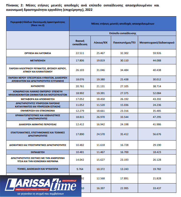 Σε σχέση με το επίπεδο εκπαίδευσης, οι υψηλότερες αποδοχές για το 2022 στους κατόχους μεταπτυχιακού/διδακτορικού τίτλου σπουδών καταγράφονται στον κλάδο των Ορυχείων και Λατομείων. Οι χαμηλότερα αμειβόμενοι κάτοχοι μεταπτυχιακού/διδακτορικού τίτλου σπουδών απασχολούνται στον κλάδο της Εκπαίδευσης.