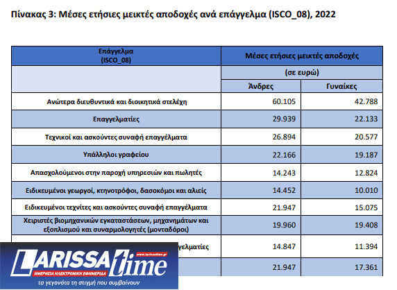 Αναφορικά με την κατάταξη των εργαζομένων κατά ατομικό επάγγελμα, οι μεγαλύτερες αποδοχές για το 2022, καταγράφονται στα ανώτερα διοικητικά και διευθυντικά στελέχη, ενώ ακολουθούν οι κάθε είδους επαγγελματίες, π.χ. γιατροί, δικηγόροι, μηχανικοί.