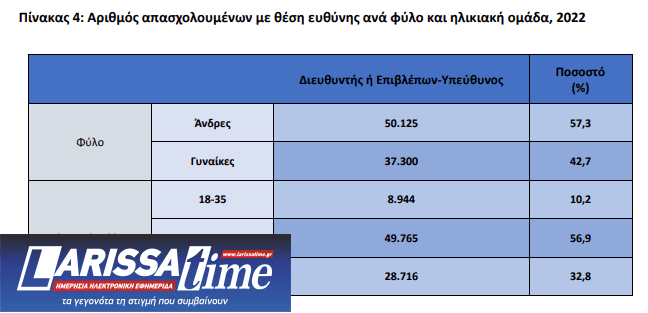 Όσον αφορά στους απασχολούμενους με θέση ευθύνης, για το 2022, αυτή καταλαμβάνεται από άνδρες σε ποσοστό 57,3%, με πρώτη την ηλικιακή ομάδα 36-54 ετών.