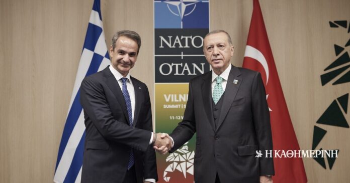 Κυβερνητικές πηγές ανέφεραν χθες ότι το τετ α τετ θα γίνει στη γνώριμη μορφή και των προηγούμενων πέντε συναντήσεων Μητσοτάκη – Ερντογάν, με τη συμμετοχή των υπουργών Εξωτερικών Γιώργου Γεραπετρίτη και Χακάν Φιντάν και των διπλωματικών συμβούλων Αννας-Μαρίας Μπούρα και Ακίφ Τσαγατάι Κιλίτς (3+3).