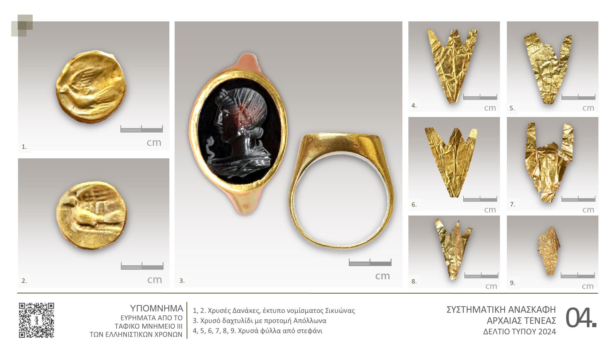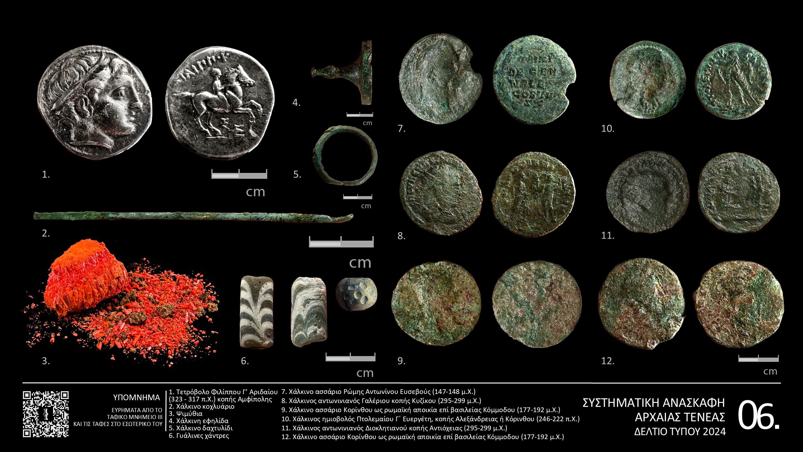 Ξεχωρίζουν χρυσό δακτυλίδι με σφραγιδόλιθο από ημιπολύτιμο λίθο (απεικονίζει τον Απόλλωνα με θεραπευτικό όφι), δύο χρυσές δανάκες (αντιγράφουν νομισματικούς τύπους της ελληνιστικής εποχής της Σικυώνας), αναθηματικό πήλινο δάχτυλο, χρυσά φύλλα από στεφάνι, απόθεση μικκύλων αγγείων (ελληνιστικών χρόνων), ασημένιο τετράβολο Φιλίππου Γ Αρριδαίου, σιδερένιες στλεγγίδες και σιδερένιο εγχειρίδιο.