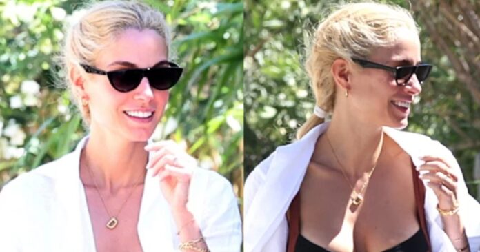 H Δούκισσα Νομικού ολοκλήρωσε την εμφάνιση με παρεό, ανέμελα δεμένο στη μέση στον ίδιο καφέ τόνο και λευκό οversized πουκάμισο.