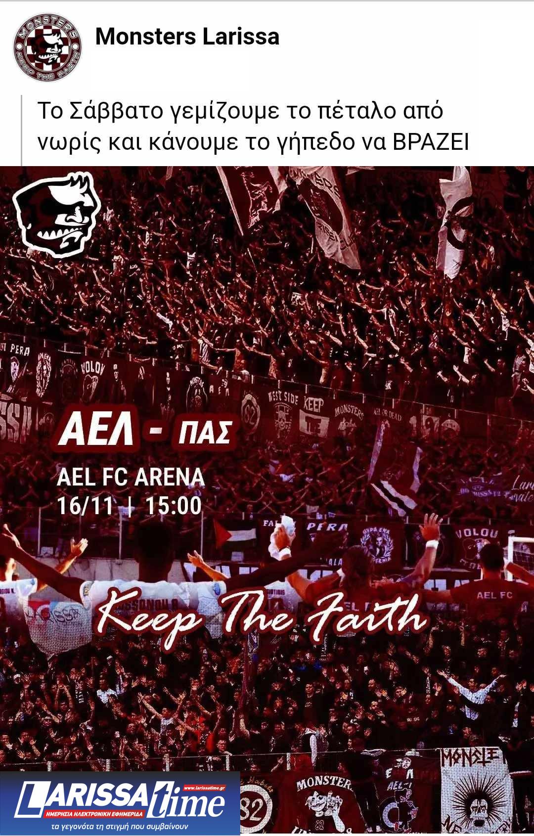 Με αφορμή την εντός έδρας αναμέτρηση της Superleague 2 της ΑΕΛ με τον ΠΑΣ Γιάννινα, που θα γίνει το Σάββατο (16/11) στο AEL FC ARENA, οι οργανωμένοι οπαδοί των «βυσσινί» Monsters Larissa, μέσα από τα social media, έκαναν την παρακάτω ανάρτηση: Το Σάββατο γεμίζουμε το πέταλο από νωρίς και κάνουμε το γήπεδο να ΒΡΑΖΕΙ.