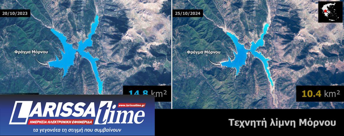 Τα δεδομένα πάρθηκαν από τον ευρωπαϊκό δορυφόρο Sentinel-2. Στις 20 Οκτωβρίου 2023 (1 χρόνο πριν) η συνολική έκταση της επιφάνειας της λίμνης ήταν ~14.8 km², ενώ στις 25 Οκτωβρίου 2024 (φέτος) υπολογίστηκε στα ~10.4 km². Η έκταση της τεχνητής λίμνης του Μόρνου για την συγκεκριμένη χρονική περίοδο υπολογίζεται ως μια από τις μικρότερες από το 2010 που υπάρχουν δορυφορικές παρατηρήσεις πολύ υψηλής ανάλυσης.