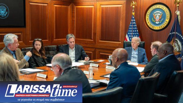 Ο Τζο Μπάιντεν συναντήθηκε με αξιωματούχους του Συμβουλίου Εθνικής Ασφάλειας στην Αίθουσα Επιχειρήσεων του Λευκού Οίκου, μετά την εσπευσμένη επιστροφή του από το Ντέλαγουερ, λόγω της επίθεσης του Ιράν με drones.