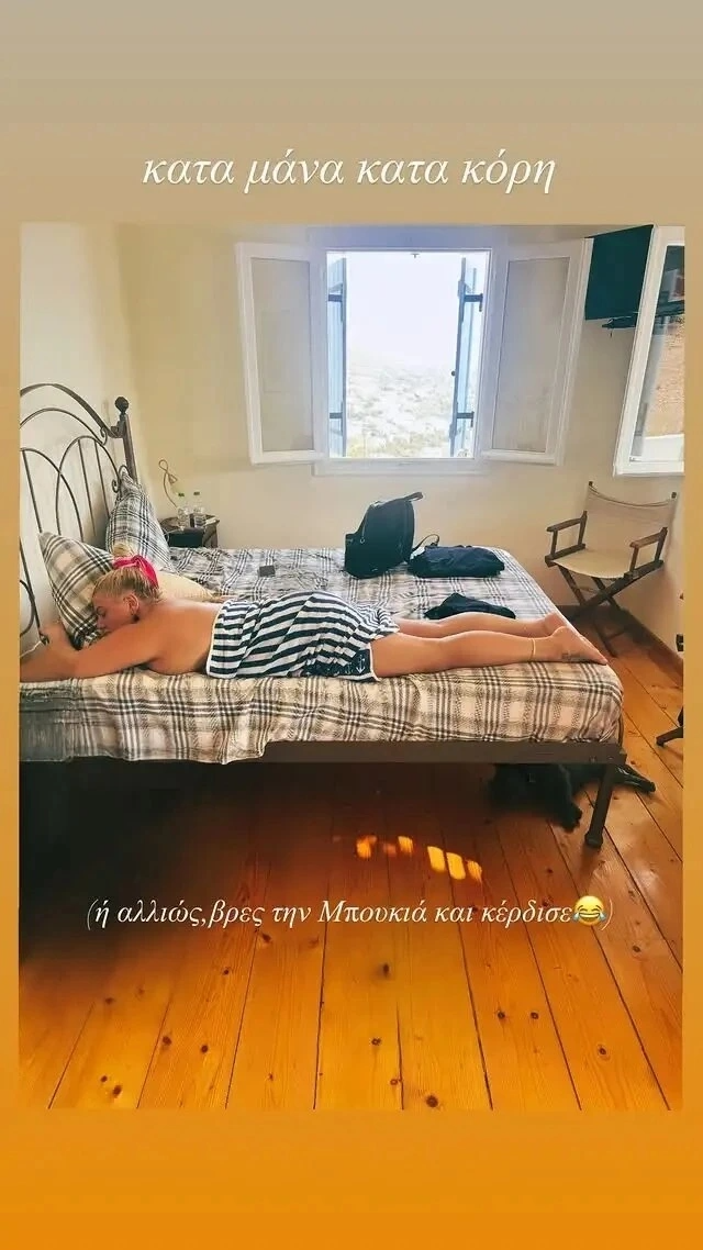 Η Δανάη Μπάρκα ποζάρει χαλαρή στο κρεβάτι της, χωρίς το πάνω μέρος του μαγιό της, έχοντας καλύψει διακριτικά το σώμα της με μια πετσέτα. Με ανεπιτήδευτη φυσικότητα, η ίδια αποτυπώνει τη χαλάρωση και την ελευθερία των διακοπών της.